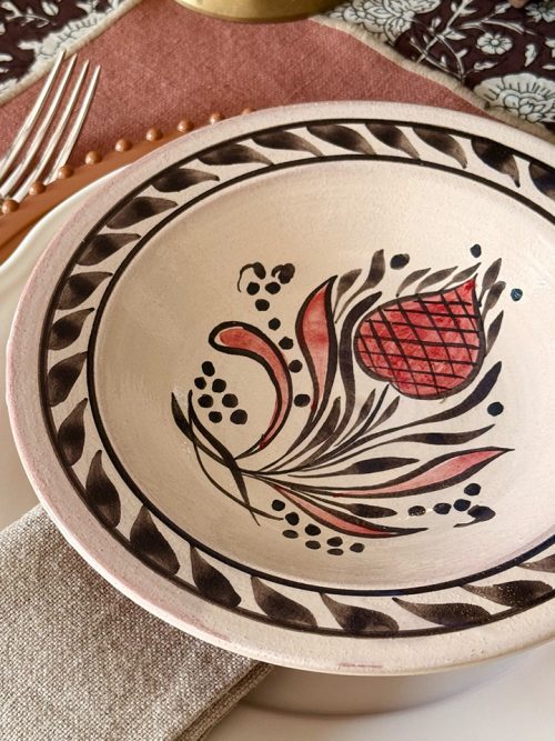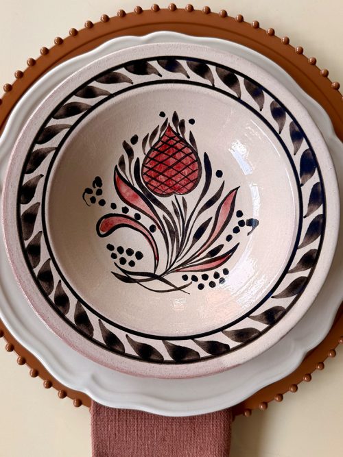 Zamansız formu ve el işçiliğiyle sofrada servis ve sunumu bir ritüele dönüştüren bu sahan, işlevselliği zarif bir estetikle buluşturur.